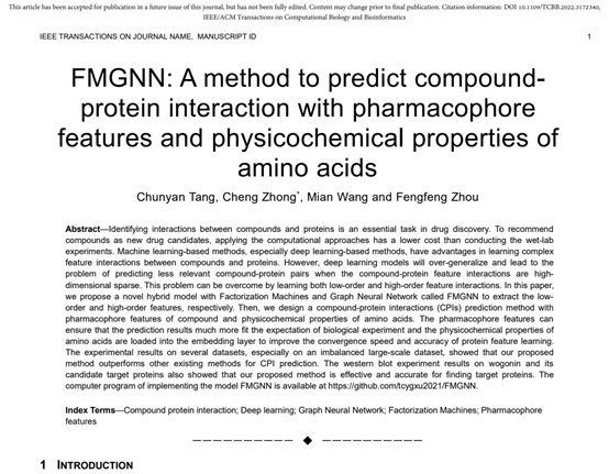 教师唐春艳工程师、钟诚教授、广西大学生命科学与技术学院王勉副教授、吉林大学计算机学院周丰丰教授的研究论文“FMGNN: A method to predict compound protein interaction with pharmacophore features and physicochemical properties of amino acids”被IEEE/ACM Transactions on Computational Biology and Bioinformatics期刊录用,且已经在线发表(DOI: 10.1109/TCBB.2022.3172340)。IEEE/ACM Transactions on Computational Biology and Bioinformatics是中国计算机学会CCF推荐的综合交叉学科生物信息计算领域顶级期刊。