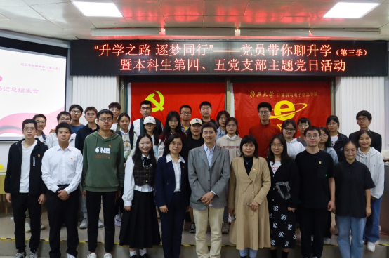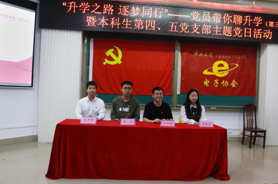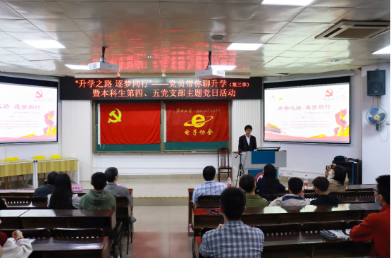 本科生第四党支部主办,联合本科生第五党支部、学院团委电子创新协会共同承办的主题为“升学之路 逐梦同行”——党员带你聊升学(第三季)升学经验分享会在学院214报告厅举行。学院党委副书记邓珍琪老师,学院学生电子创新协会指导老师、电子信息工程系主任张学军教授,本科生第四党支部书记、学院团委副书记杨洋老师,本科生第五党支部书记、学院专职组织员薛金凤老师,学院专职辅导员庞承业老师出席会议。本次升学经验分享会由学院电子创新协会2021级本科生蔡其峰同学主持,通信工程191班朱硕隆同志、通信工程182班吴艳丽同志、网络工程192班姜岩同志、通信工程171班赵彦雪同志为本次分享会主讲人。