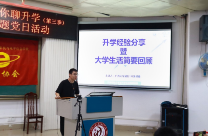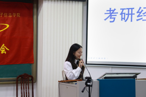 第二位经验分享人是2021年成功考研升入广西大学读硕的通信工程182班吴艳丽同志。吴艳丽同志分享了自己的考研动力、信息获取渠道、如何选择报考学校与专业、如何复习各考试科目,并鼓励同学们在考研的过程中要保持良好心态、坚持不懈。