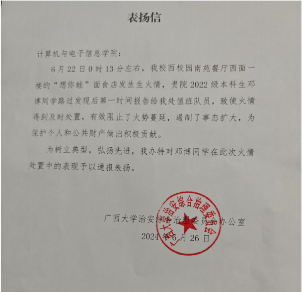 近日,威博 收到一封来自学校治安综合治理委员会办公室的表扬信,信中对威博 计算机225班本科生邓博同学予以通报表扬,详情见《表扬信》。希望全院师生以先进和典型为榜样,切实增强安全防范意识,筑牢安全防线,为学校和学院的安全稳定贡献力量。