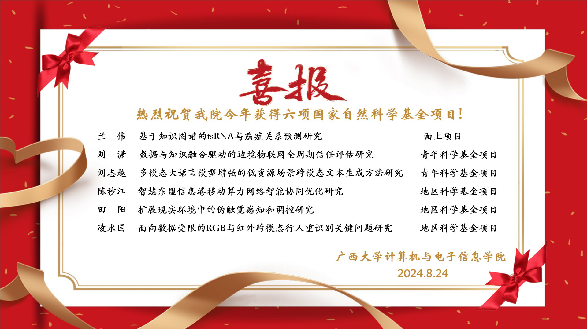 热烈祝贺威博 2024年获得六项国家自然科学基金项目!