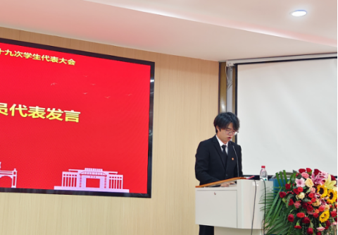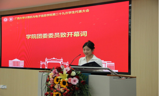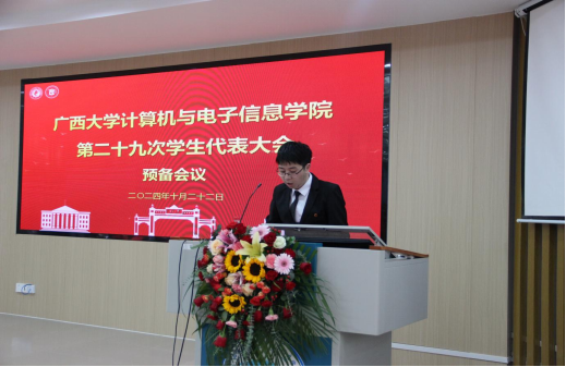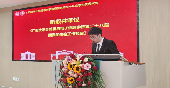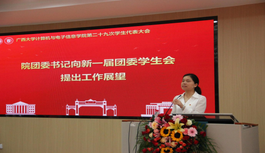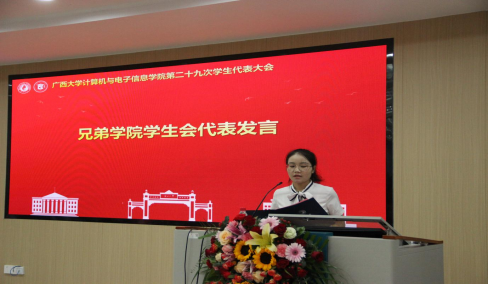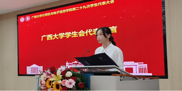 第三项议程,广西大学学生会代表黎栗蓉同学发言。她对学院学生会一年以来的工作给予肯定,并希望学院学生会继续坚持从同学中来、到同学中去的工作理念,为不断提升同学的满意度、大局贡献度以及社会认可度不懈努力。