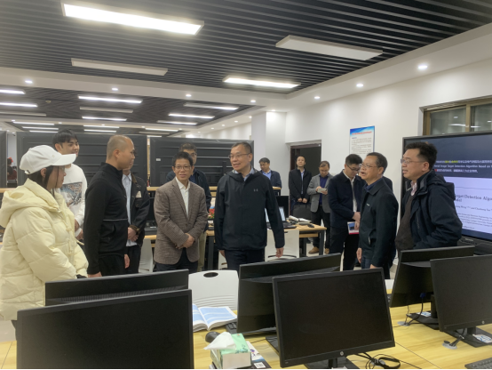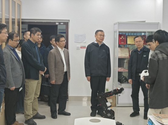305无人机与机器人图形像与虚拟现实技术物联网技术实验室、中国-柬埔寨智能制造技术联合实验室看望留校师生。韩校长观摩了学生团队正在调试测试的robomaster机甲大师比赛项目——六轴机械臂机器人,该项目是由威博