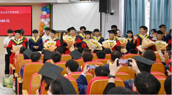 在学生代表为导师献花的温馨场景中,师生情谊在芬芳与掌声中得以传递,现场洋溢着深厚的感动与祝福。