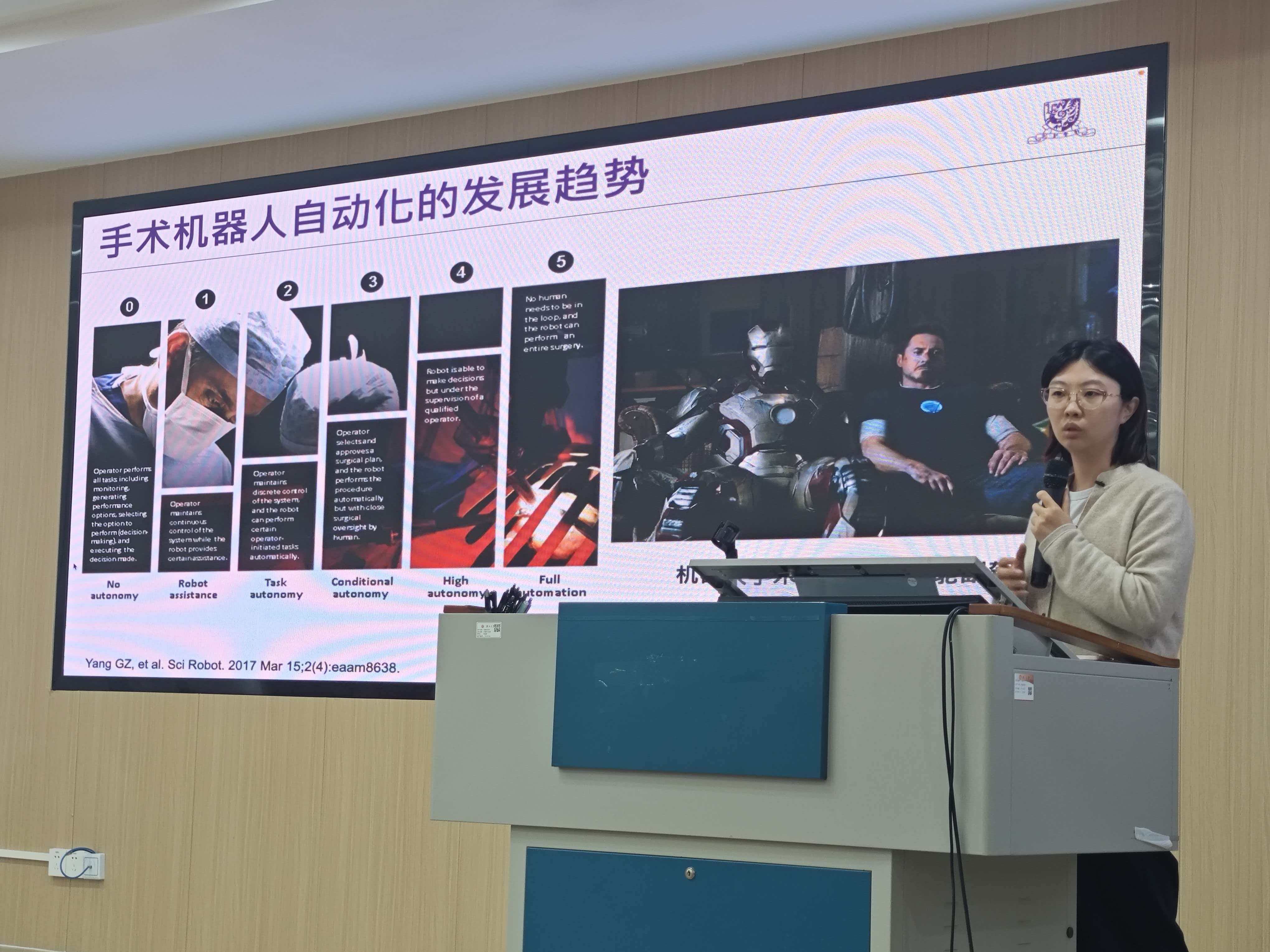 随后,窦琪副教授以“手术机器人与具身智能”为题作专题报告,系统介绍了国内自主研发医疗机器人领域的前沿进展。她从技术演进、产业现状及应用场景等多个维度,深入分析了我国医疗机器人在核心技术突破、自主可控和临床落地方面取得的重要成果。
