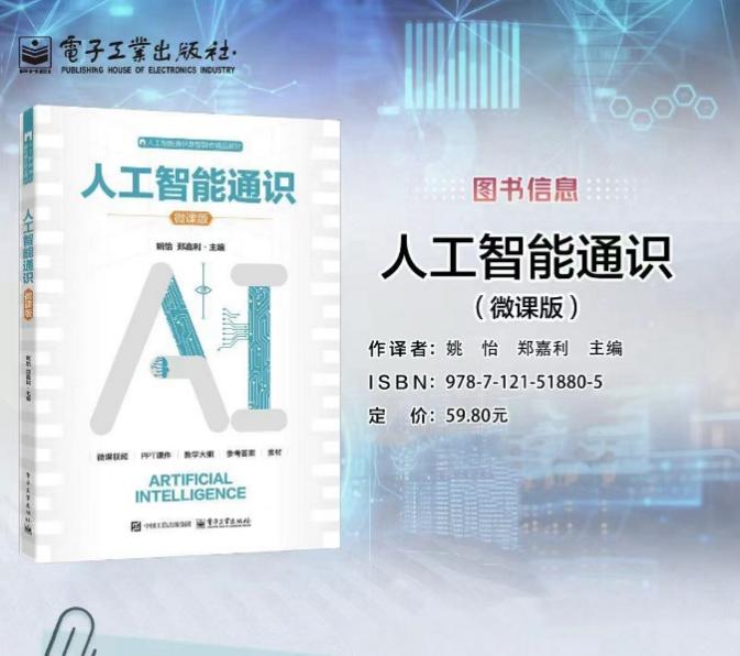 为配合在线课程的学习,由姚怡、郑嘉利主编,电子工业出版社出版的配套教材《人工智能通识(微课版)》也已同步推出。该教材集成了微课视频、PPT课件、教学大纲及丰富的教学素材,通过纸质教材与数字化资源的深度融合,为学生提供更加便捷、高效的学习路径。
