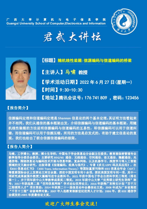 广西大学君武大讲坛:随机线性装箱: 信源编码与信道编码的桥梁