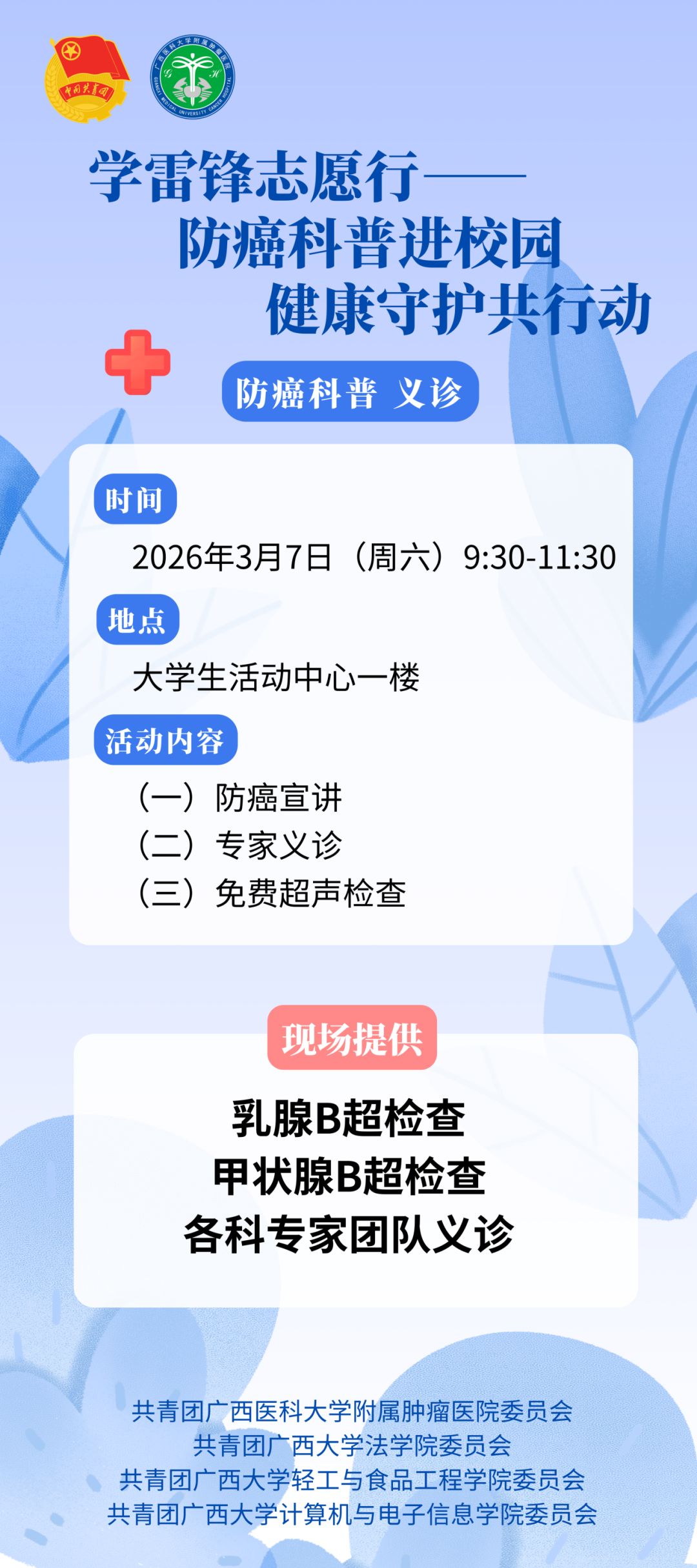 委员会,联合共青团广西医科大学附属肿瘤医院委员会,将于2026年3月7日开展“学雷锋 志愿行--防癌科普进校园,健康守护共行动”主题公益活动。