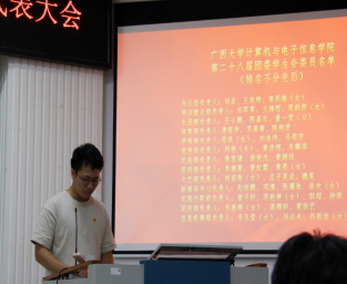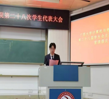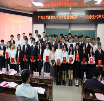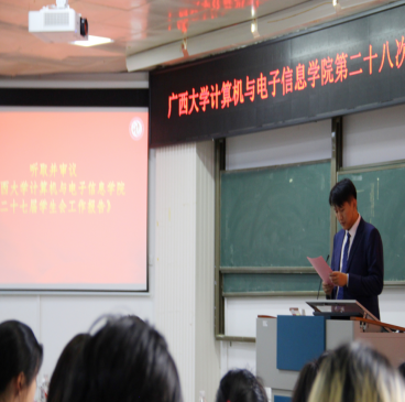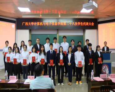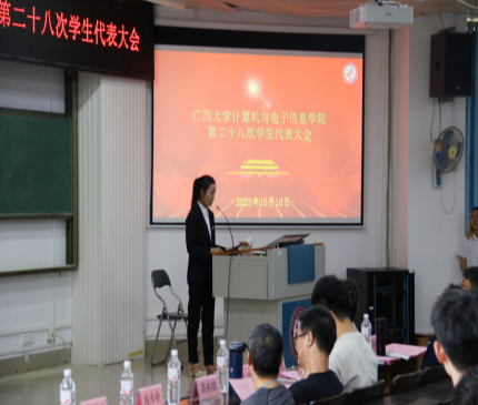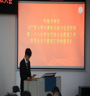 第二十八次学生代表大会在学院214报告厅顺利召开。学院党委副书记邓珍琪老师,学院团委副书记杨洋老师,学院辅导员刘智斌、庞承业、黄柏雄、李易明、张星月和林文潮老师,以及学院学生会成员和各班级代表参加会议。会议由陆雅娟同志主持。