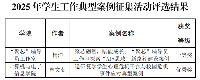 根据《关于开展2025年学生工作典型案例征集活动的通知》相关要求,广西大学学生工作处在全校范围开展2025年学生工作典型案例征集活动。经个人申报、专家评审,共评选出获奖案例68项,其中:一等奖10项,二等奖15项,三等奖20项,优秀奖23项。